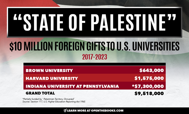 In February 2020, Brown University, an Ivy League school with a tax advantaged $6.5 billion endowment, negotiated a $643,000 gift from a foundation located within the “State of Palestine” to create a new Palestinian professorship within its Center for Middle East Studies.